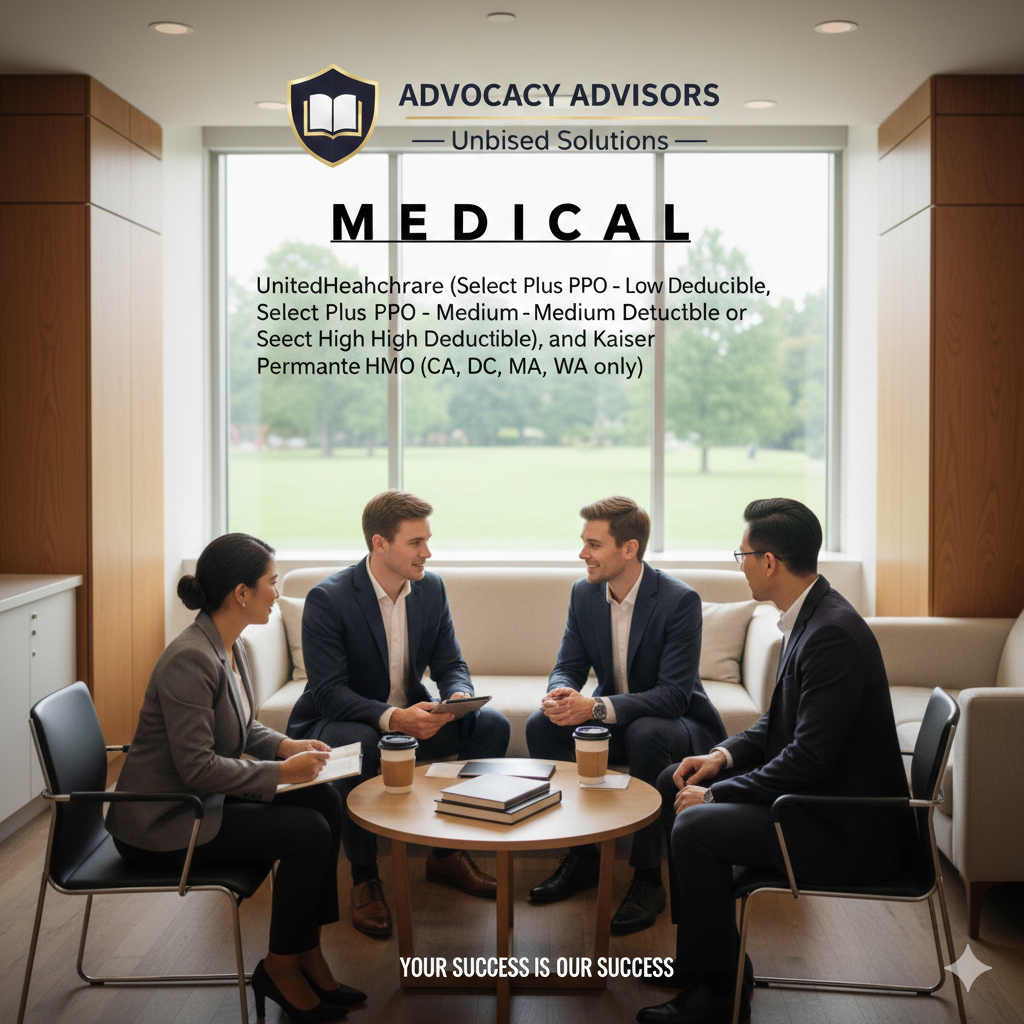 We offer several different medical plans to meet the needs of Our Team: UnitedHealthcare (Select Plus PPO - Low Deductible, Select Plus PPO - Medium Deductible or Select Plus PPO - High Deductible), and Kaiser Permanente HMO (CA, DC, MA, VA, WA only)
