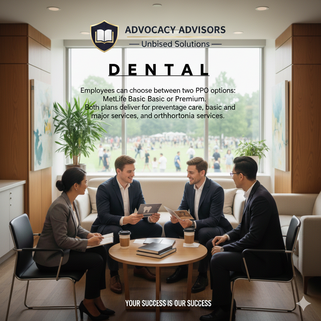 Employees can choose between two PPO options: MetLife Basic or Premium. Both plans deliver coverage for preventative care, basic and major services, and orthodontia services.